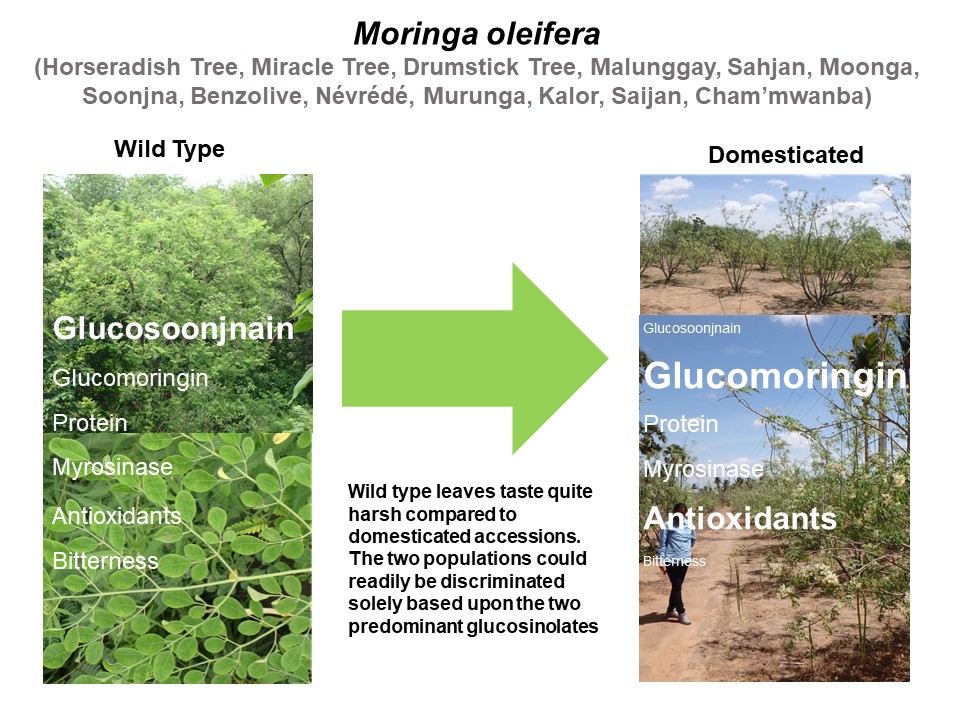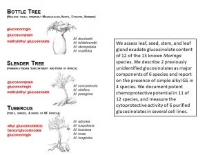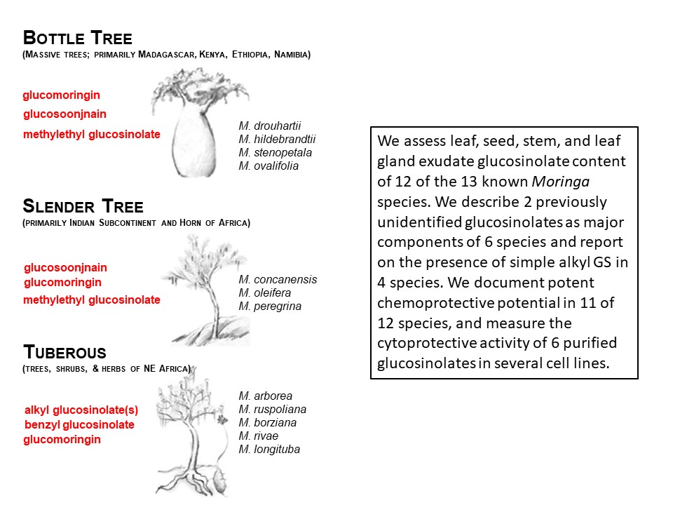 The second paper features work done by Gwen Chodur while a student at the Chemoprotection Center.  Relationship between content of the newly discovered glucosinolates and taste were evaluated, as was protein content, and other characteristics important to the nutritional and medicinal characteristics of Moringa oleifera.  Difference in harshness of taste between wild type and domesticated accessions of this protein-rich species could be readily discriminated by a taste panel in Mexico, based solely upon the presence of the two predominant glucosinolates.  These results give powerful impetus to efforts to improve Moringa, because they suggest that careful selection can maximize chemoprotective potency and nutrition with no sacrifice of flavor.