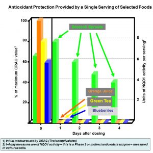 The immediate and direct antioxidant power of one serving of broccoli sprouts is similar to one serving of orange juice, green tea, or blueberries (0 days; left panel). One day later, sulforaphane-rich broccoli sprouts are very powerful indirect antioxidants (8 million units per serving; right panel). In contrast, the other foods retain only very weak indirect antioxidant activity (thousands of units per serving). Notably, broccoli sprouts still retain one half of their high indirect antioxidant potency, even 96 hours later.